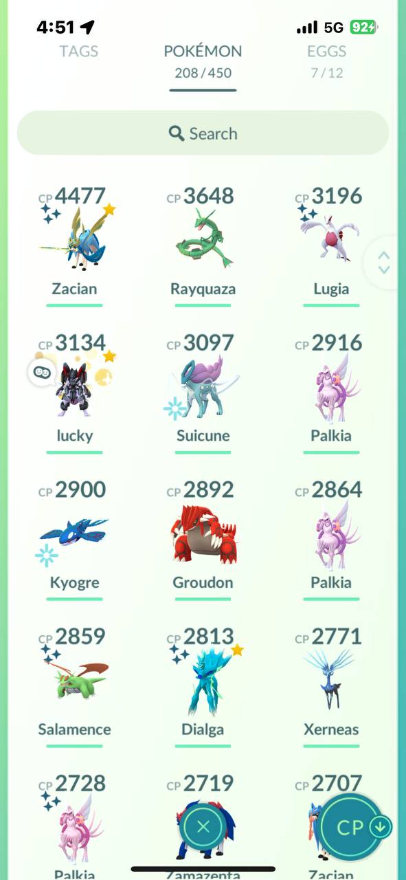 Multiple high‑CP legendaries including Rayquaza, Lugia, Kyogre, Groudon, Xerneas, Palkia, Dialga and Zamazenta, many above 2800–3600 CP.