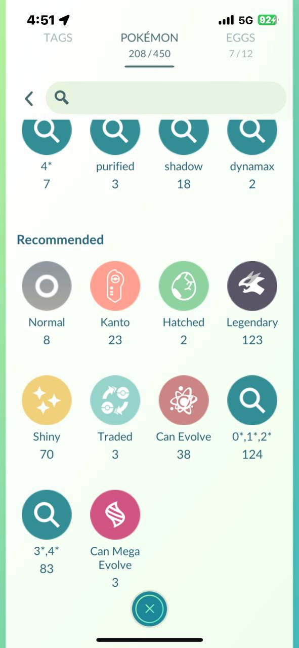 208/450 Pokémon storage used and 7/12 eggs, leaving space to keep farming without immediate upgrades.