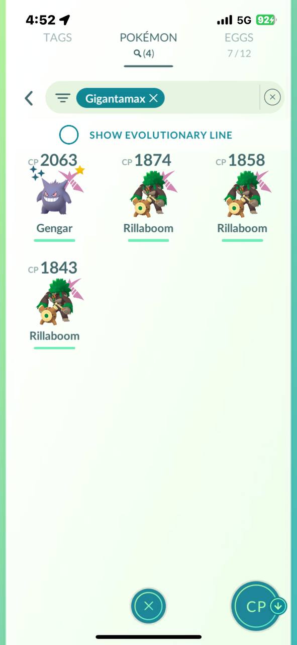 The Gigantamax section includes G‑Max Gengar (shiny) and several G‑Max Rillabooms near 1,800+ CP, ready for Gigantamax raids and showcases.