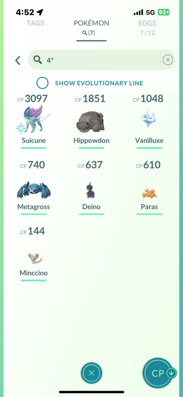Dedicated 4* search tab shows perfect‑IV Pokémon such as Suicune (~3097 CP), Hippowdon (~1851 CP), Vanilluxe, Metagross, Deino, Paras and Minccino.