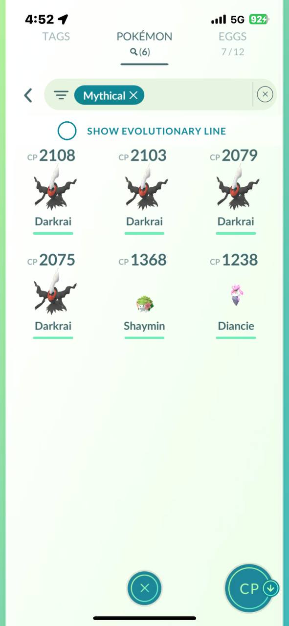 Mythical tab includes multiple Darkrai (four above 2,000 CP), Shaymin and Diancie, giving a solid mythical lineup for raids and special trades.