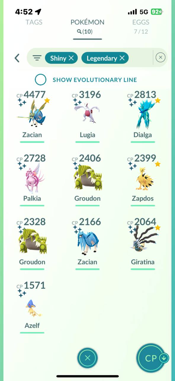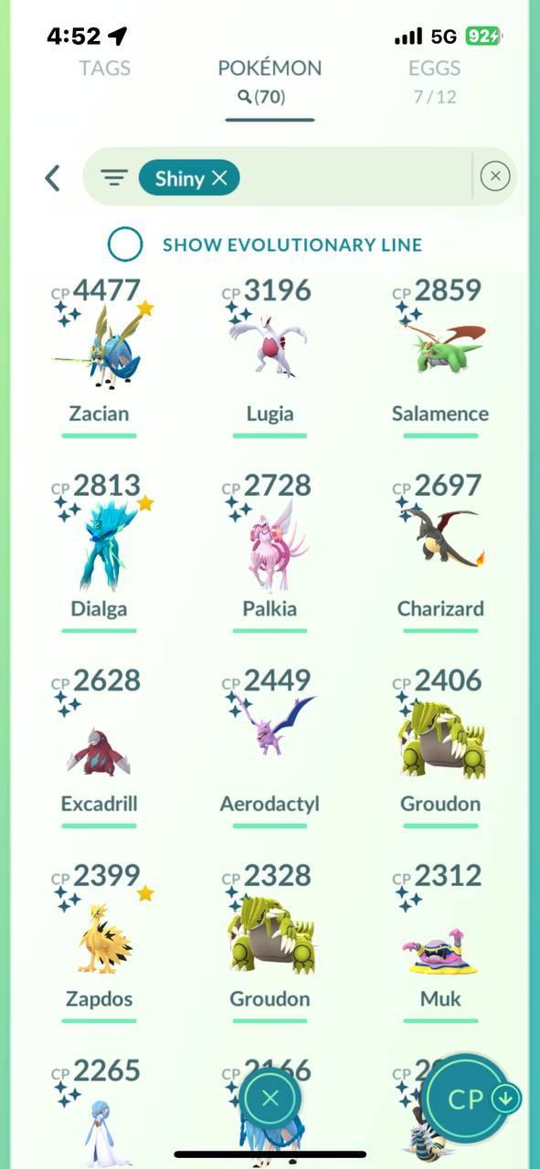 Collection of shiny legendaries such as Lugia, Dialga, Palkia, Groudon, Zapdos, Giratina and Zacian, giving strong shiny raid options and trade value.