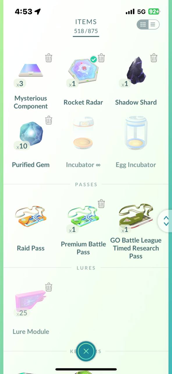 Item storage currently holds 518/875 items, leaving good room for Poké Balls, berries and future raid rewards.
