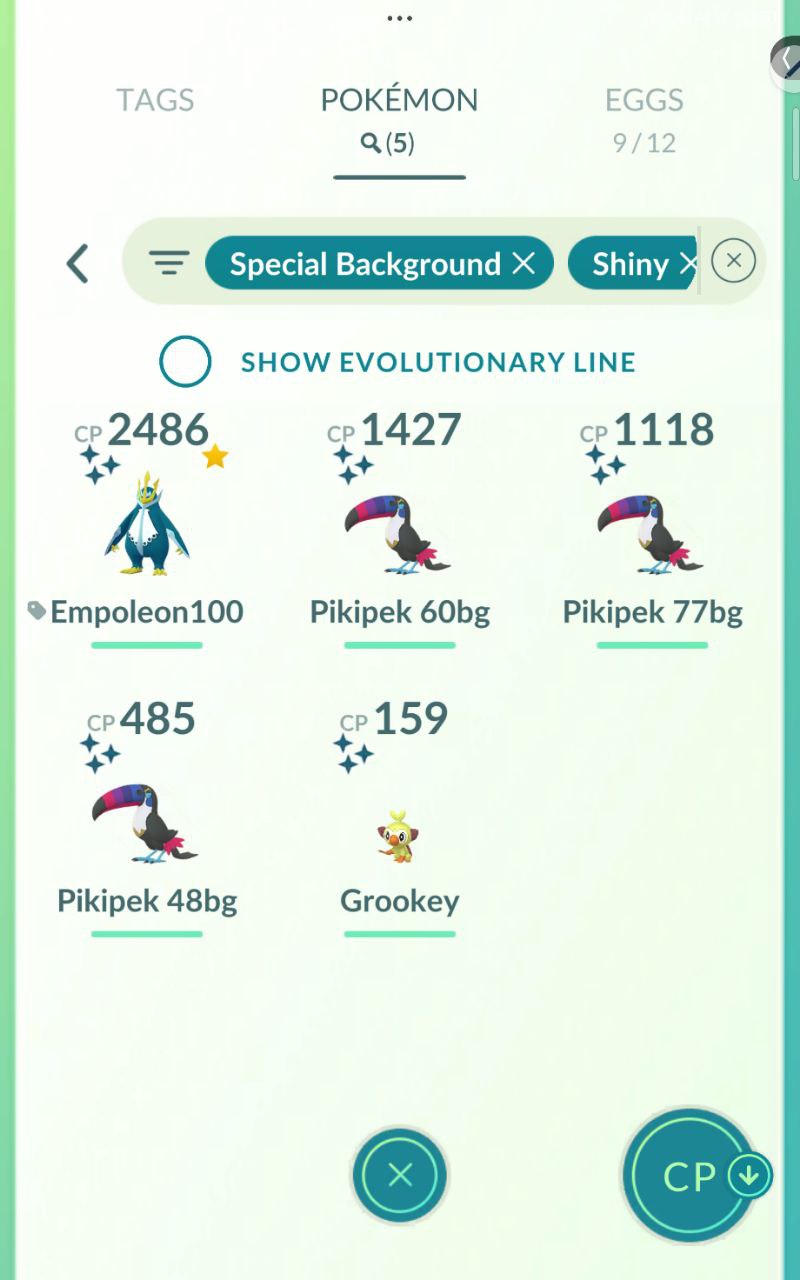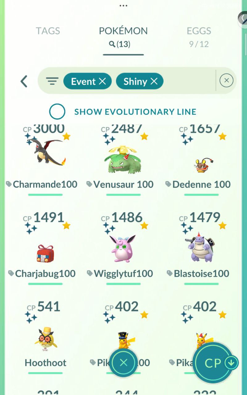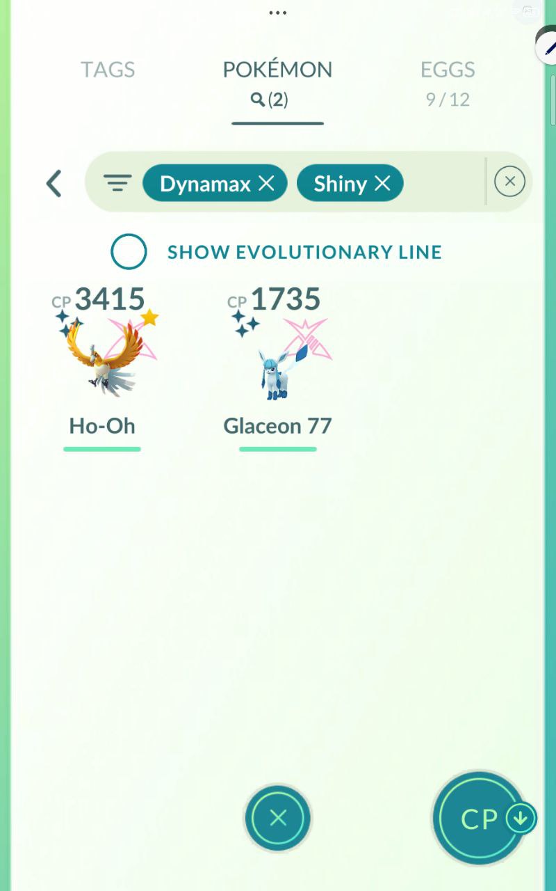 Shiny Collection (114 tags): Hundreds including special background shinies like Piplup/Empoleon line (CP 2486/1427/1118), Pikipek/Grookey (485/159/77bg), event shinies like Charmander/Venusaur/Charjabug/Wigglytuff/Blastoise (CP 3000+/1491/1486/1479), Hoothoot/Pikachu (541/402/402), and Dynamax Shiny Ho-Oh/Glaceon (CP 3415/1735).