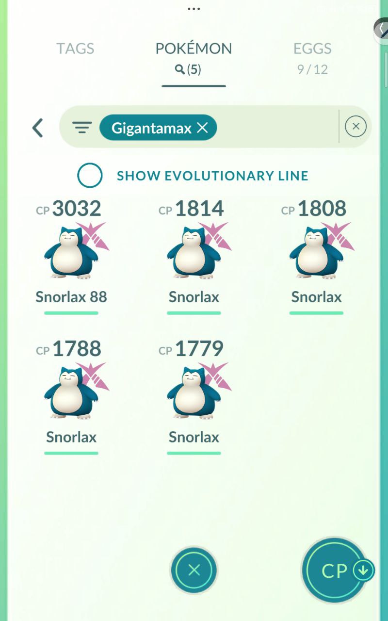 Gigantamax Snorlax multiples (CP 3032/1814/1808/1788/1779), showcasing high-CP variants for raids and battles.