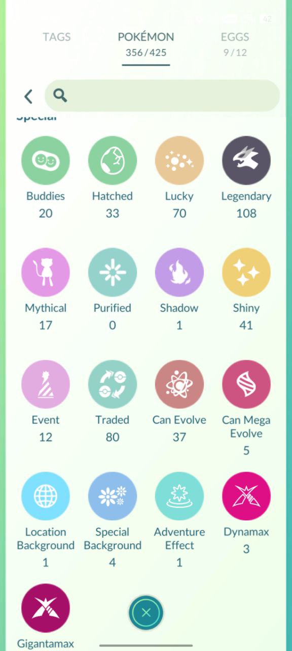 Robust tags showcase depth: 41 shinies, 108 legendaries, 17 mythicals, 70 lucky hatched, 80 traded, 12 events, 35 can-evolve, 1 special background, 3 Dynamax effects, Gigantamax present.