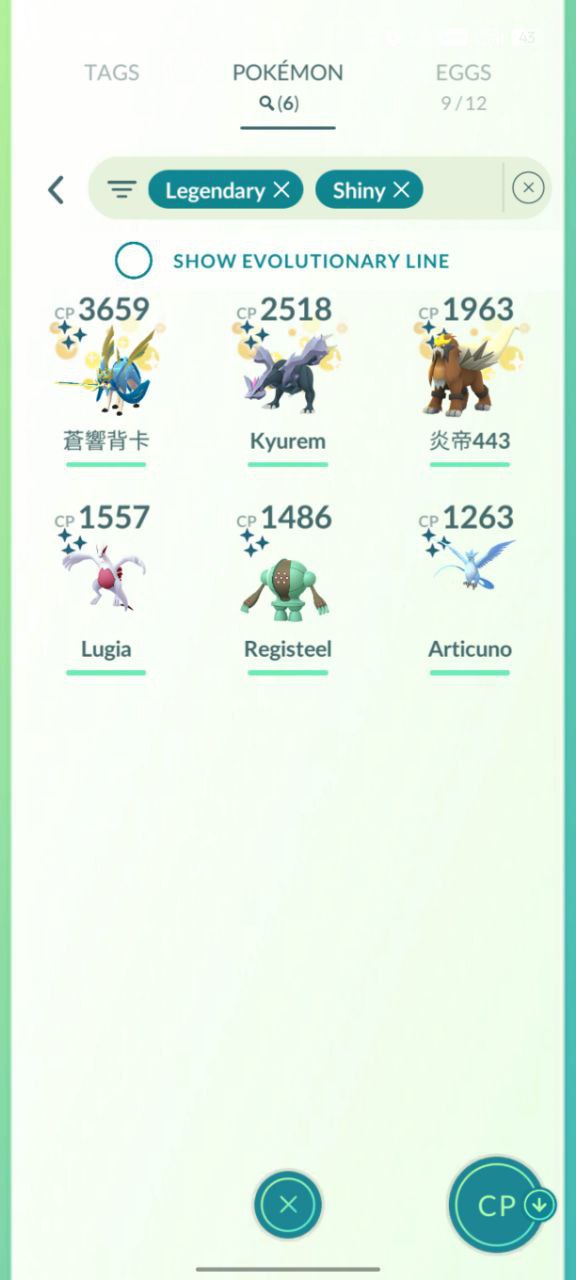 2x Shiny Legendaries in Poké Balls: Classic captures including Kyurem (659/2518/1963), Lugia/Registeel/Articuno (1557/1486/1243).