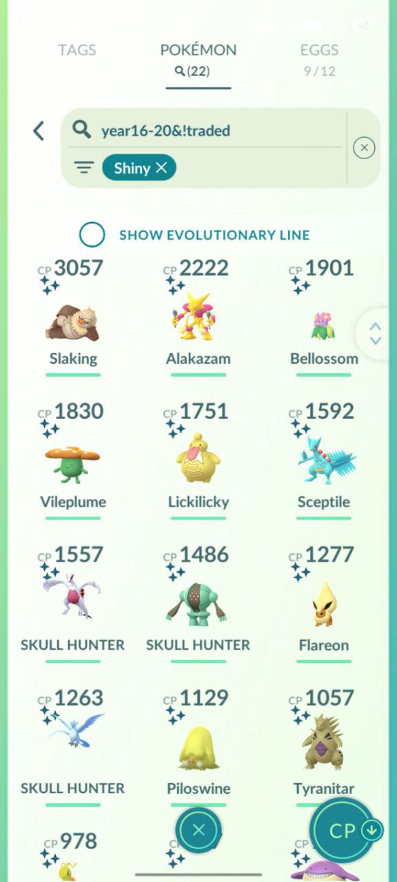 3x Shiny Legendaries (2016-20, LL Tradable): Year16-20 traded shinies like Staking/Alakazam/Bellossom (3057/2222/1901), Vileplume/Lickitung/Sceptile (1830+/1751/1592)—rare vintage pulls.