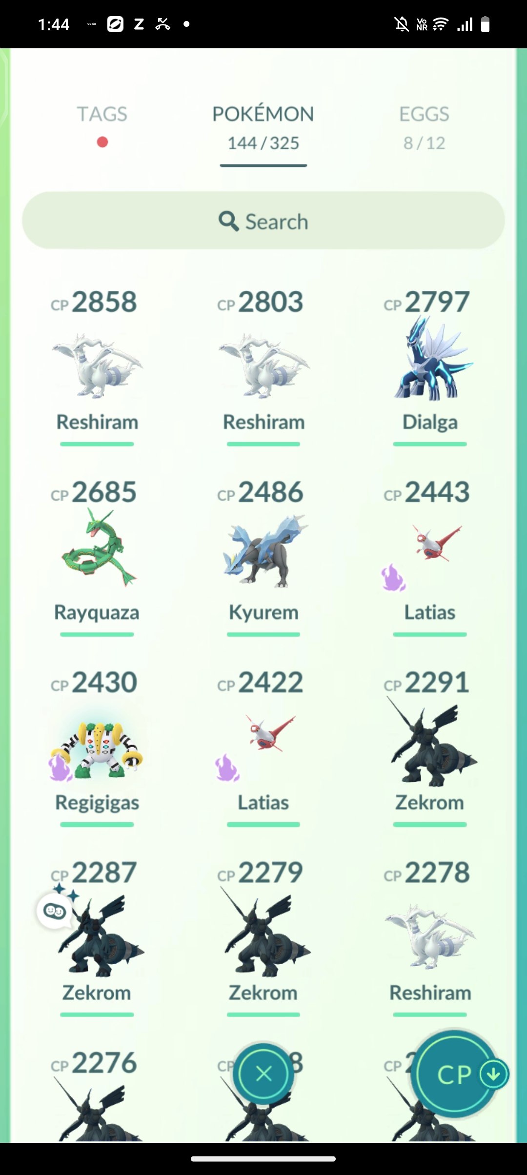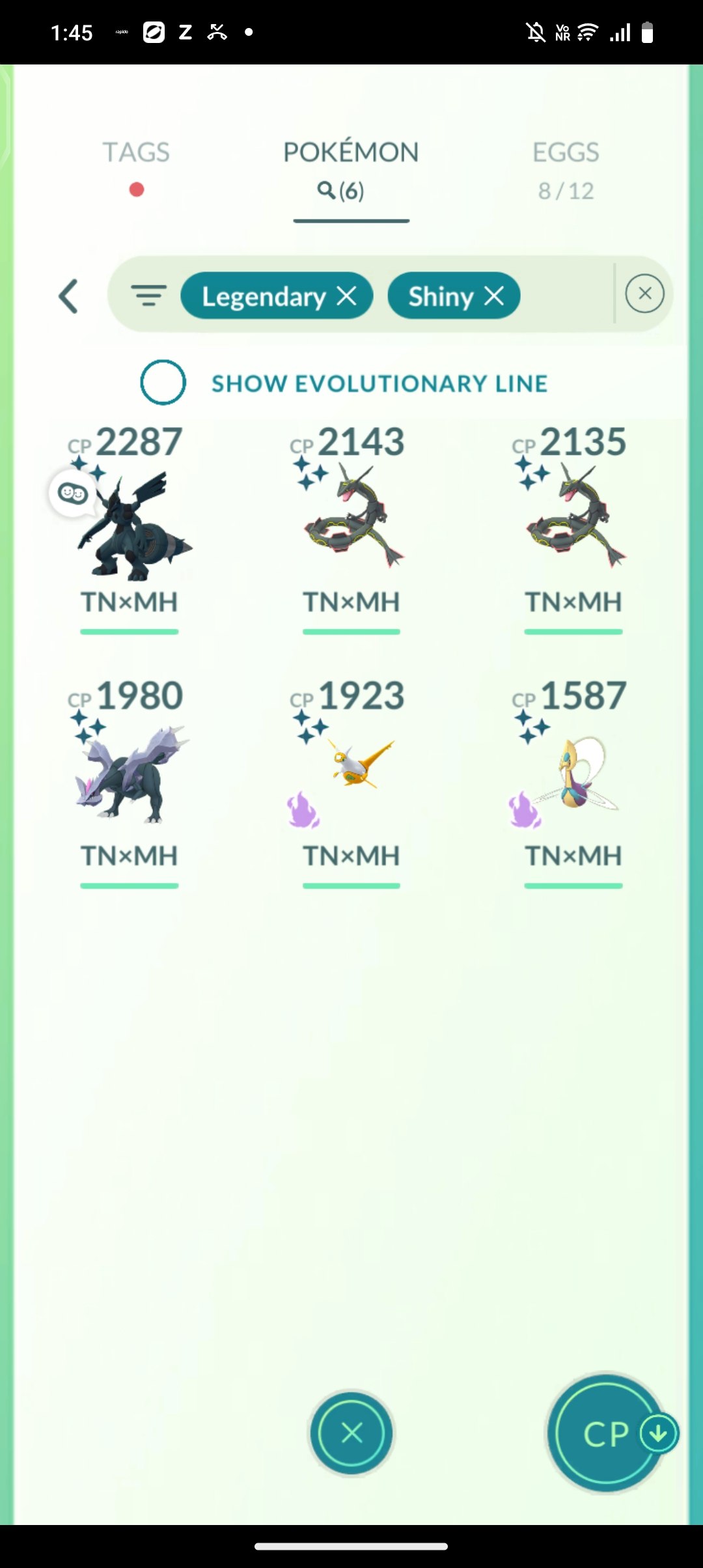 Shiny legendaries dominate the roster, including multiple high-CP variants like a 2287 CP base form, 2143 CP mega-capable evo, and 2135 CP line member, alongside others at 1923, 1980, and more. Standouts include a mega-evolvable shiny with Rayquaza Candy at 2143 CP (TN MH, 7m tall), perfect for dragon/flying dominance, and a fusion-ready shiny at 1980 CP with 338 stored energy. A shadow legendary line at CP 287 and purified options like Latias at 1923 CP add versatility, with XL candy stocked for further upgrades.