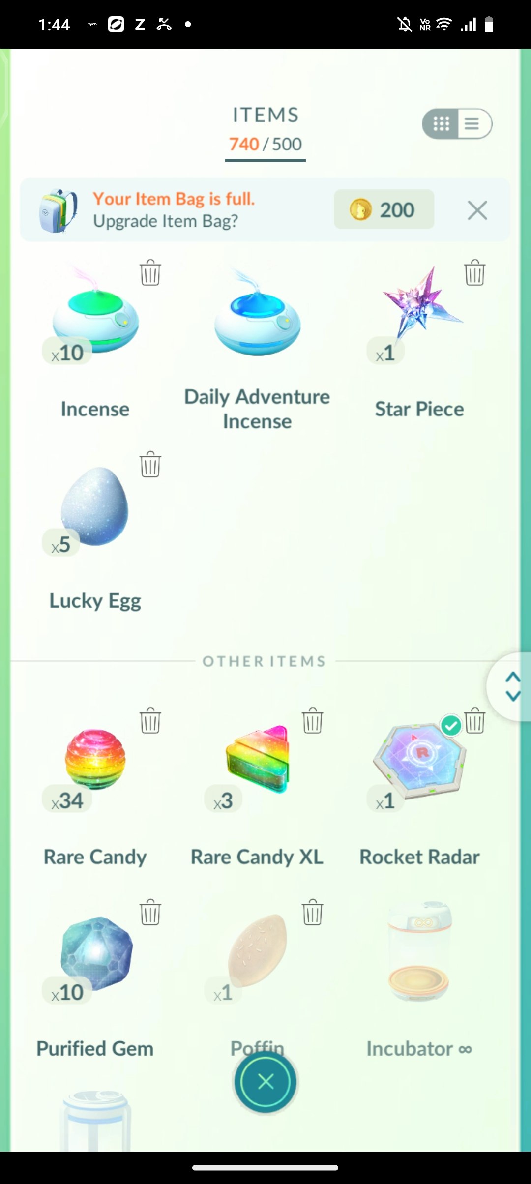 Item bag is well-stocked: 370 item upgrades, 200 coins, 10 adventure sync incense, 5 eggs, 34/3/1 candies (rare/XL), 10 purified gems, 1 rocket radar, and incubators for events. Ample stardust (500k+ potential via power-ups) and candies (Zekrom, Wailmer, etc.) support rapid progression.