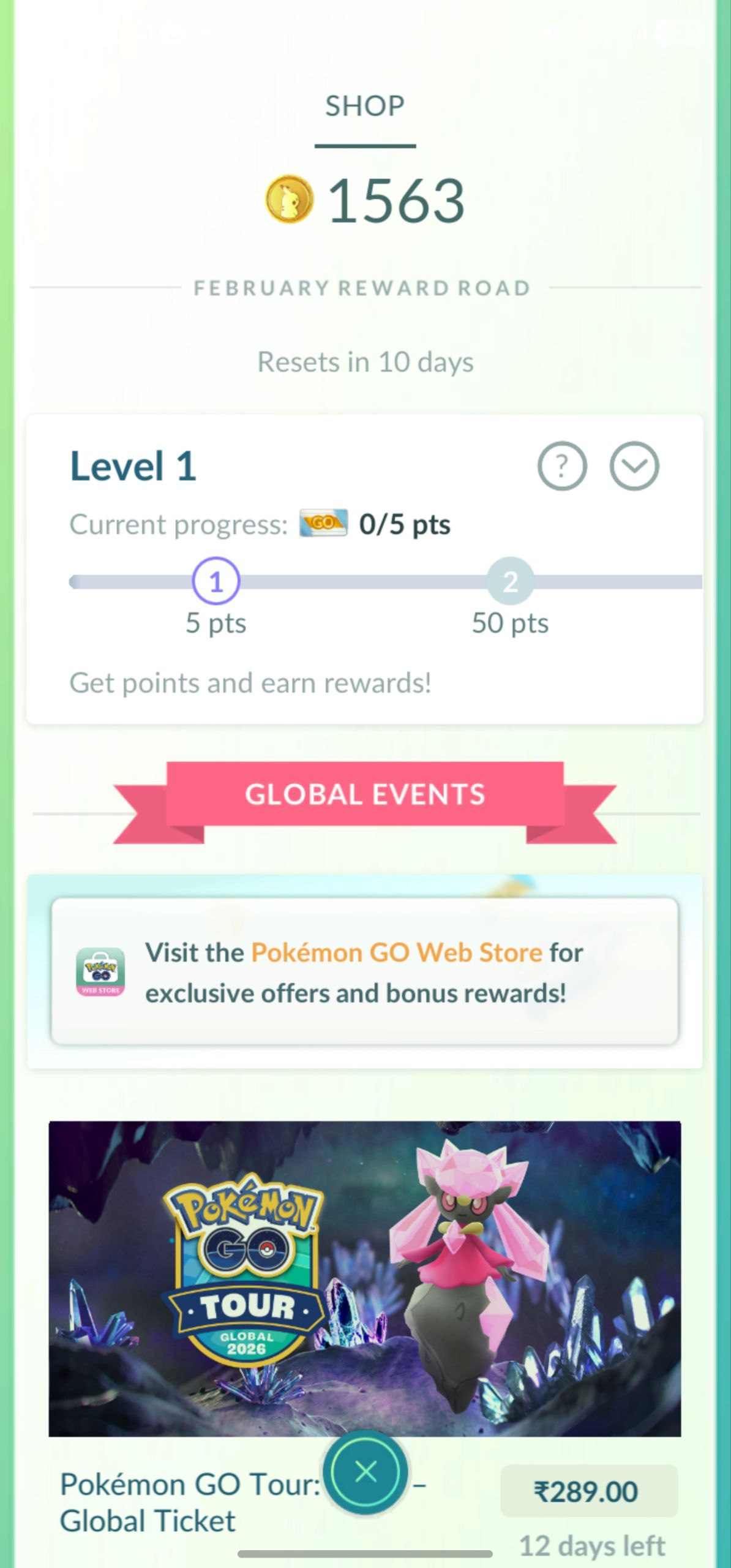 Shop & Events: 1563 PokéCoins, February Road Level 1 progress.