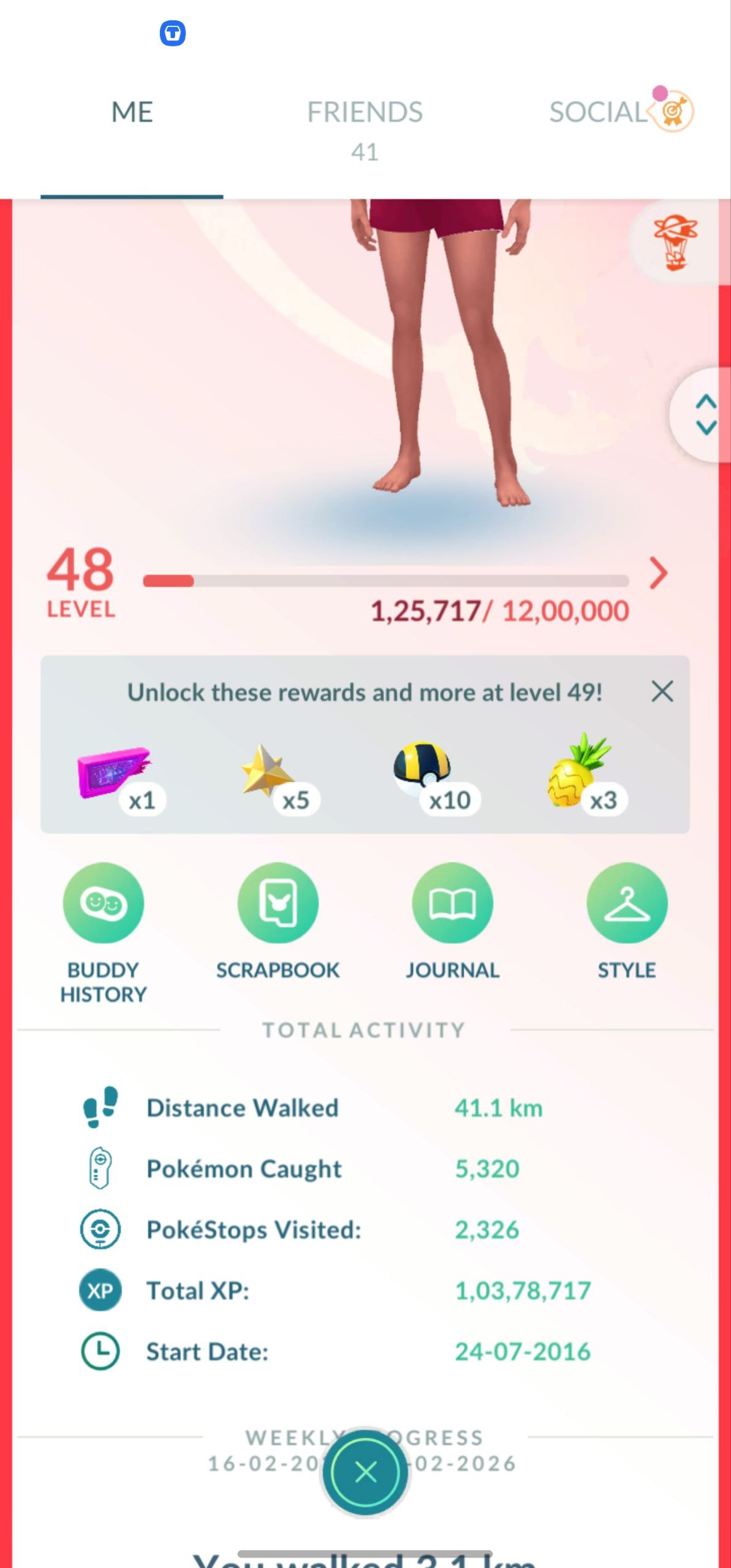 Level 48 Profile: 2016 start date, 48km walked today, multiple medals earned, nearing Level 49 rewards.