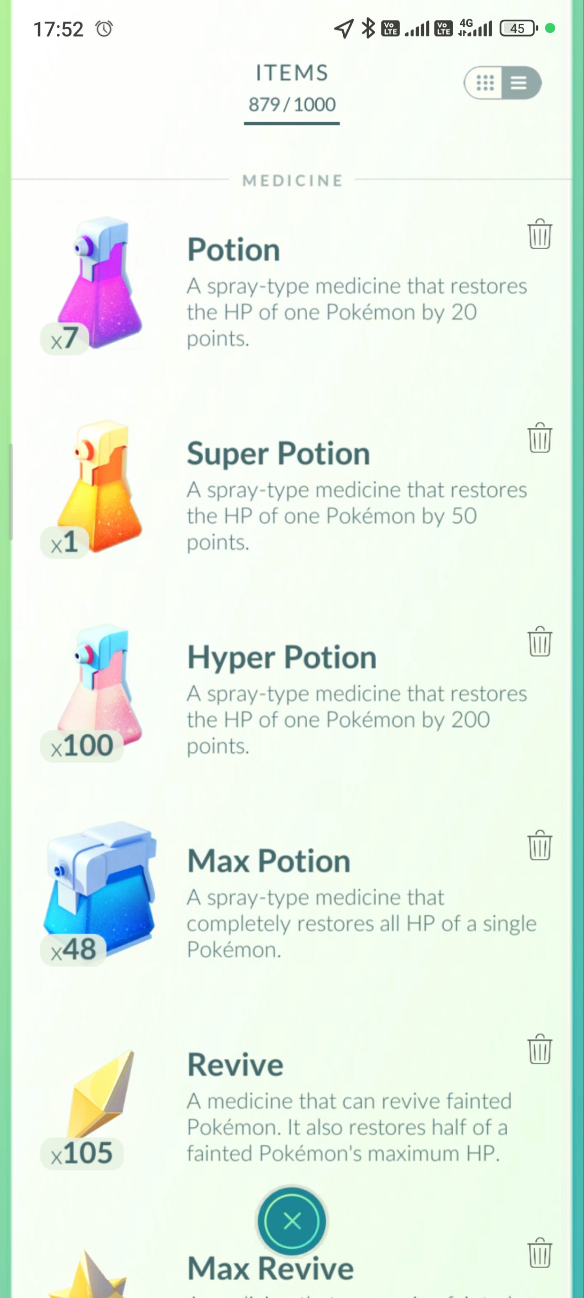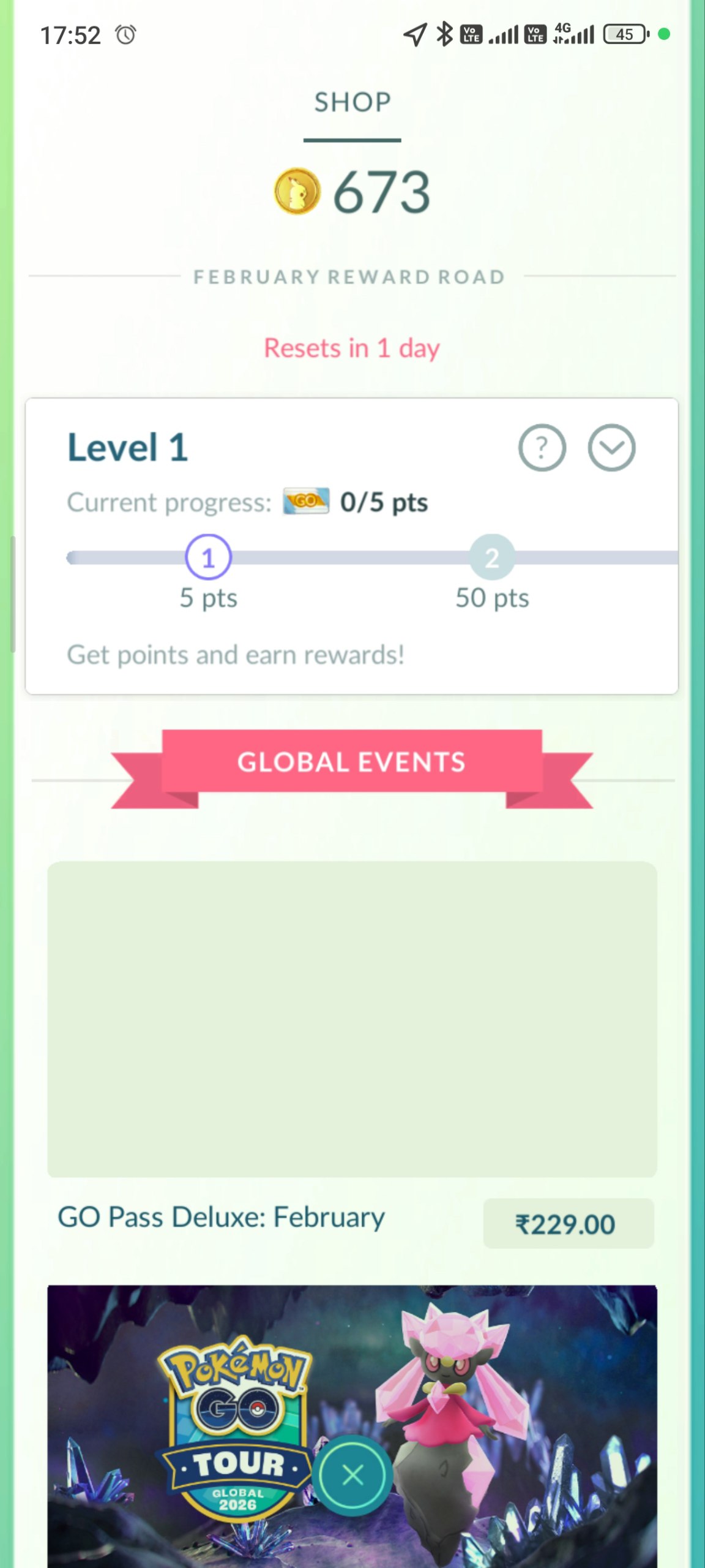Well-stocked inventory: 100+ Max Potions, 48 Super Potions, 105 Revives, 7 Max Revives for battle recovery. Recent GO Pass Deluxe: February (₹290) progress at Level 1 with global events active; strong coins (673 on reward road). Supports ongoing events with appraisal stars (80 perfects) and egg hatches (9/12 specials).