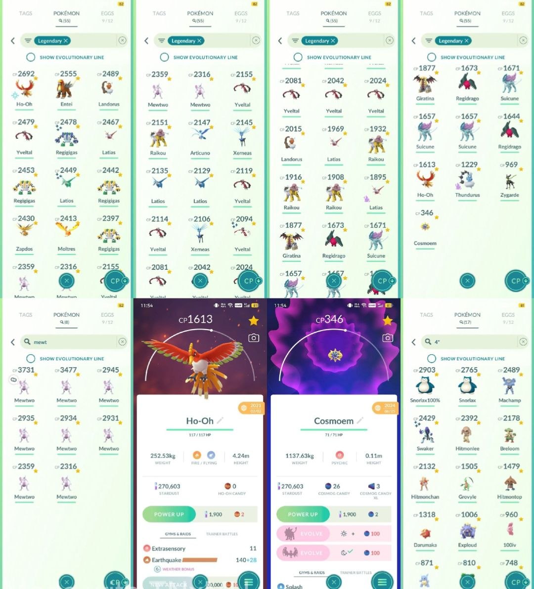 Pokémon GO account 532a shiny legendary and 100IV hundo list