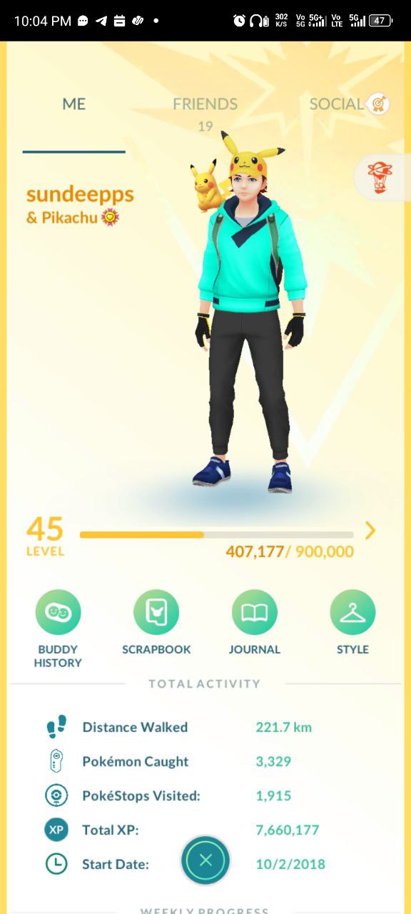 Active since 10/2018 to 2026, Level 45 (407M XP), 222km walked, 1.3M PokéStops/3.3M catches, 19 medals including gold Platinums. Profile shows Sundeep & Pikachu buddies, primed for endgame play.